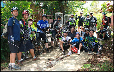 Setelah semua teman berkumpul dan selesai ngisi perut buat bekal gowes nanti, memakai peralatan tempur seperti protektor, saya agak kaget karena teman goweser semua membawa dan memakai protektor lengkap, lutut dan siku tangan, bahkan full body sedangkan saya sama sekali tidak membawa apa apa, bukan karena sok kebal, tapi memang saya belum punya ptotektor, dan yang lebih mengganggu lagi saya manggul kamera DSLR saya dengan lensa 18-135 IS yang lumayan besar di tas slempang yang mau pindah pindah terus sepanjang saya gowes, sangat tidak nyaman, setelah itu kita pun berkumpul diluar warung Mang Ade untuk diberi briefing singkat oleh ketua rombongan dan berdoa, dan tidak lupa foto bersama ... :) rombongaan berjumlah 21 orang...