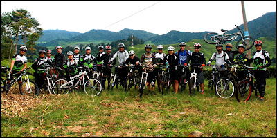 Setelah semua teman berkumpul dan selesai ngisi perut buat bekal gowes nanti, memakai peralatan tempur seperti protektor, saya agak kaget karena teman goweser semua membawa dan memakai protektor lengkap, lutut dan siku tangan, bahkan full body sedangkan saya sama sekali tidak membawa apa apa, bukan karena sok kebal, tapi memang saya belum punya ptotektor, dan yang lebih mengganggu lagi saya manggul kamera DSLR saya dengan lensa 18-135 IS yang lumayan besar di tas slempang yang mau pindah pindah terus sepanjang saya gowes, sangat tidak nyaman, setelah itu kita pun berkumpul diluar warung Mang Ade untuk diberi briefing singkat oleh ketua rombongan dan berdoa, dan tidak lupa foto bersama ... :) rombongaan berjumlah 21 orang...